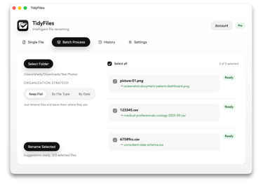 Review the suggested names, edit if needed, and apply. Undo anytime with full rename history. Watch folders auto-organize new files.