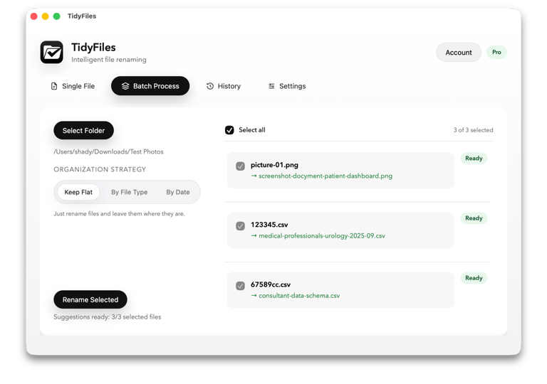 TidyFiles reads your documents, images, and spreadsheets to generate clean, semantic names you can trust. Keep your team organised without manual cleanup.